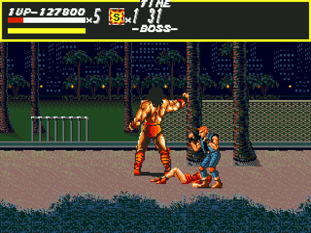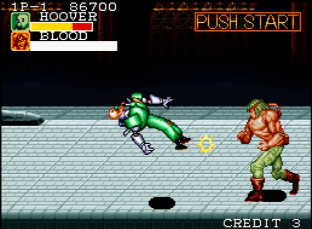 ステージ7のボス「ブラッド」筋肉質な白人の軍人 見た目はストⅢのアレックスに似ているかな、残像を残しながらの高速キックは脅威的
